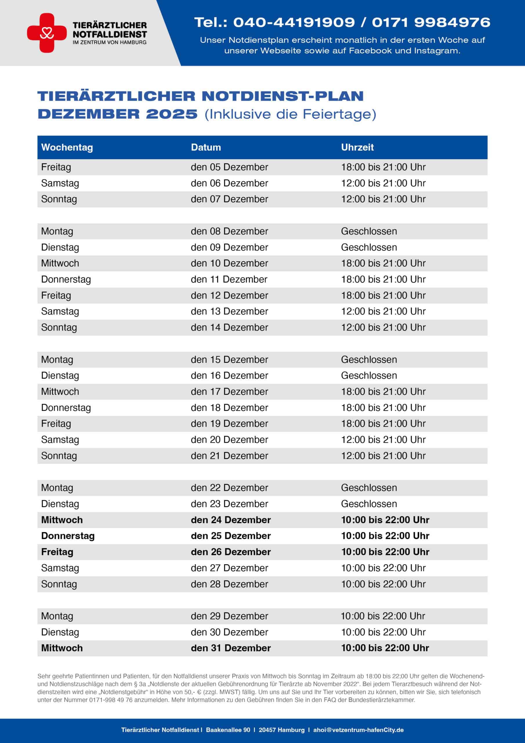 Unser Tierärztlicher Notdienst ist für Tierbesitzer schnell und leicht zu erreichen, findet immer im Zentrum von Hamburg statt und ist von Mittwoch bis Sonntag in der Zeit von 10 Uhr bis 22 Uhr für Sie erreichbar.